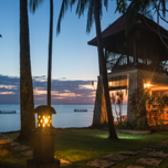 - Lush tropical landscaping with frangipani and coconut palms